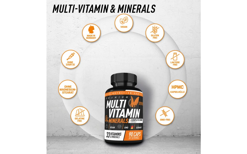 Sichere Dir jetzt mit unserer Multi-Vitamin & Mineral Sport Formula Deine tägliche Grundversorgung mit allen essentiellen Vitaminen, Mineralstoffen und Spurenelementen, so wie Vitalstoffen & Co-Faktoren. Jede Kapsel liefert Dir 33 wertvolle Nährstoffe speziell entwickelt für den Bedarf und die hohen Anforderung von körperlich aktiven Menschen, häufig gestressten Personen, oder bei hypokalorischer Ernährung im Kaloriendefizit (z.B. Diät zur Gewichtsredukton).