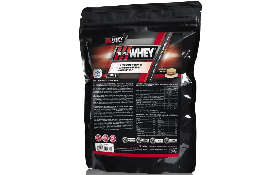 Frey Nutrition Triple Whey enthält eine speziell ausgewählte 3- Komponten Whey-Protein Mischung