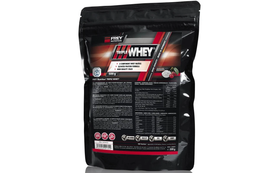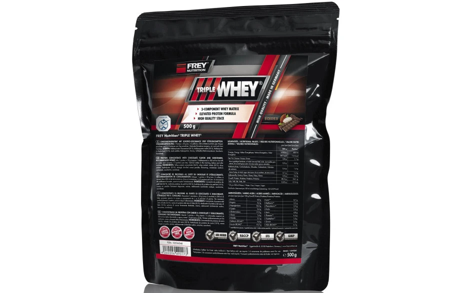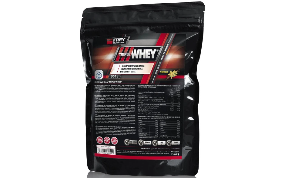 Frey Nutrition Triple-Whey – Premium Qualität aus Deutschland! Eine hohe Rohstoffqualität, der extrem hohe Eiweißgehalt von 94,3% i.Tr. und ein extrem aufwändiger und schonender Herstellungsprozess in dem eine Denatuierung des Proteins vermieden wird, lässt Frey Nutrition Whey Protein von handelsüblichen, teilweise auch sehr billigen Molkenproteinenkonzentraten in Puncto Rohstoffqualität deutlich unterscheiden!